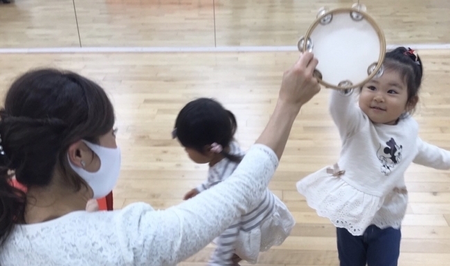 まずはタンバリンをあちこち触ったりひっくり返して観察してから、こんな風に音を鳴らすことをみんなでゲーム感覚で楽しみます。そんなときの子どもたちの輝くばかりの笑顔ったらありません。「タンバリンの音を鳴らす」ことに全身で集中し、楽しみ、夢中です。