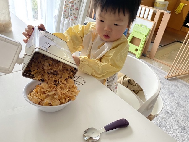 - シリアルをお皿に入れる⇨◯(こぼしたときようのミニちり取りと箒も常備)