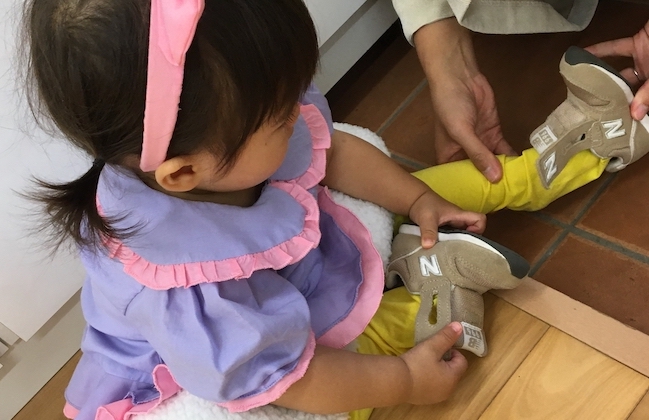 自分で履く!という2歳の女の子。ひとりで頑張っていますがなかなか踵がスポっと入りません。
